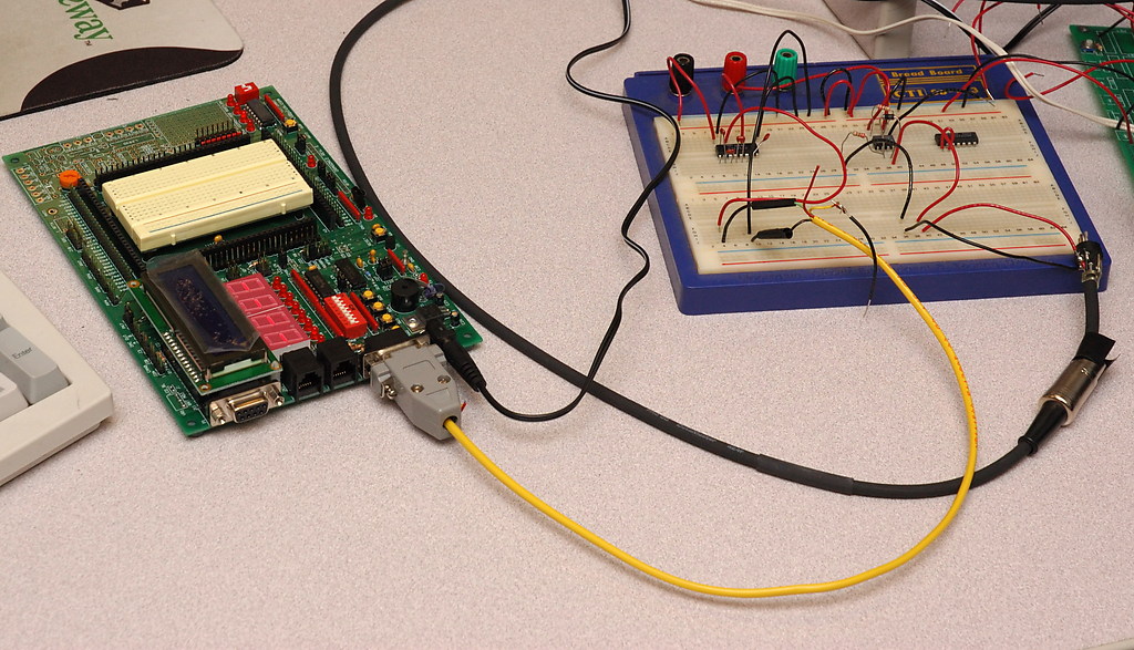 A MIDI interface (on the breadboard) is used to connect a MIDI controller