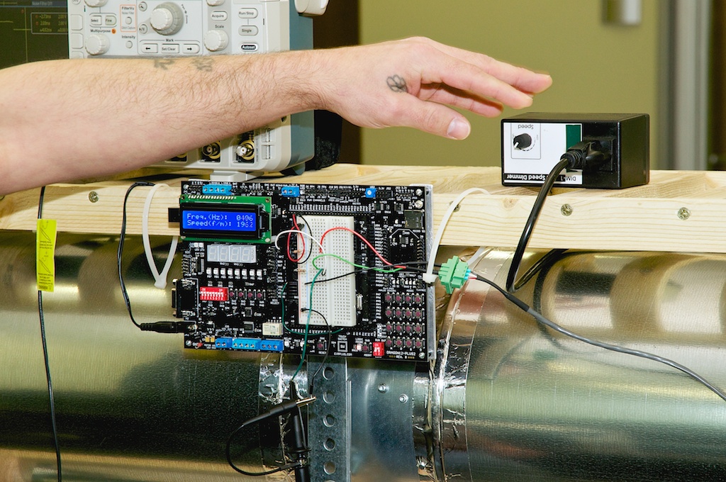 "The wind meter creates a pulse, at frequencies relative to air flow speed, while the microcontroller measures the frequency of the pulse, manipulates the data, and displays it in frequency (Hz) and speed (f/m) on the Dragon board LCD."
