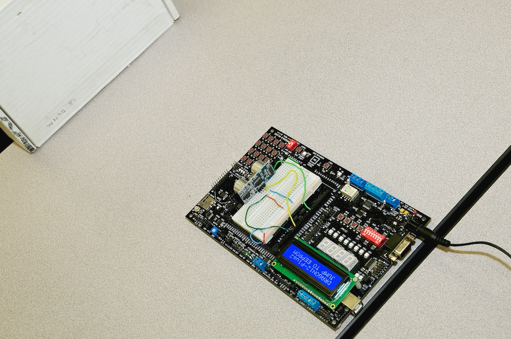 "My idea for the term end project is to use an ultrasonic module HC-SR04 and the Dragon-12 microcontroller board as a home garage proximity sensor for parking a vehicle at the appropriate distance from the wall."