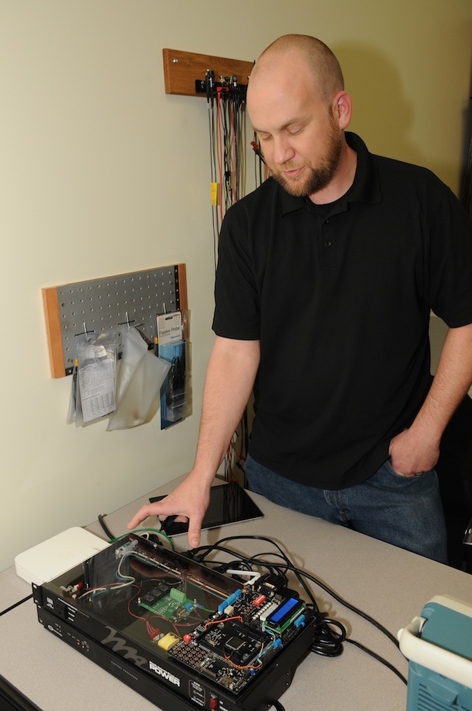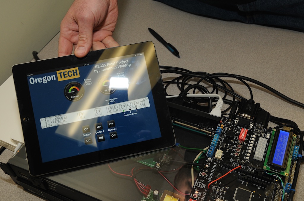 "Modified rack-mount surge protector to have controllable outlets and current sensing outlets. Dragon12 board communicates with a Crestron controller via RS-232 for iPad application."