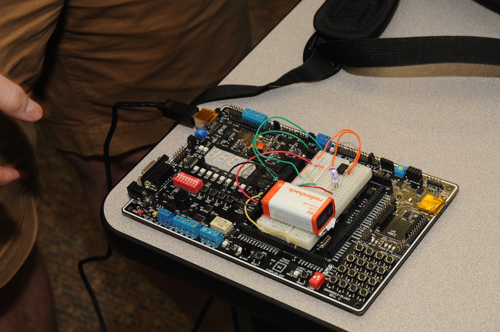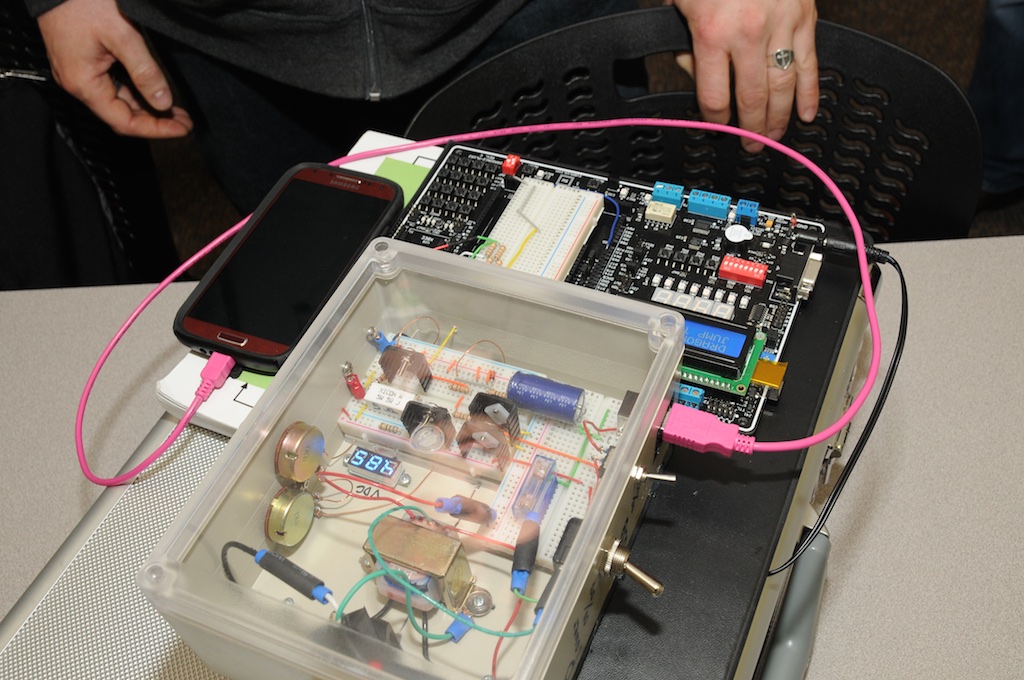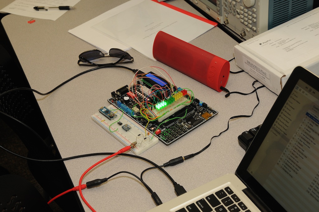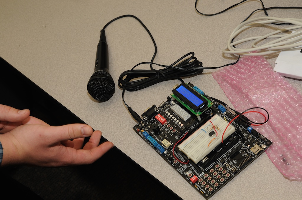 "The assignment is comprised of an audio input and the resulting output displays the fractional volume level on a 14-segment LED display."