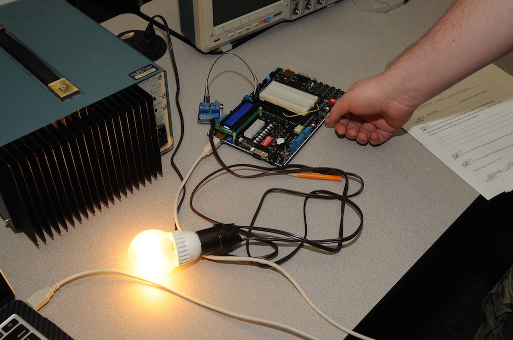 "The project is a daylight harvester, a device that will read ambient light and adjust an externally connected incandescent lamp based on the need for more light."
