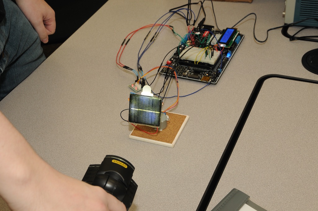 "Light dependent resistors detect the direction of greatest luminosity in order to position a solar panel to receive the light at the most optimal angle. The values for luminosity are sent to the microcontroller where they are compared and the greater luminosity will cause the microcontroller to send a command to a stepper motor where it will turn clockwise or counterclockwise to meet the light at the optimal angle."