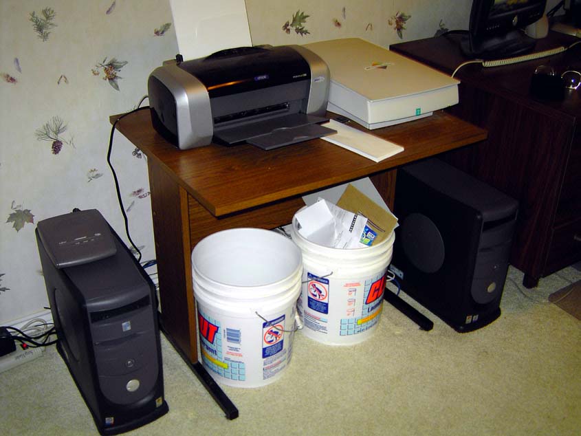 To the left of my desk are the scanner, printer, trash and recycling buckets,