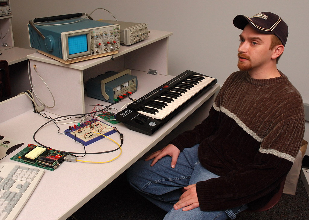 A MIDI interface (on the breadboard) is used to connect a MIDI controller