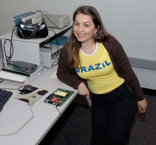 Temperature Sensor Interface to the Liquid Crystal Display by Cirlene Rahin The Analog to Digital Converter in the 68HCS12 reads the voltage output of a temperature sensor, converts to degrees Fahrenheit, and displays the temperature on the LCD display. Yes, she's from Brazil. |