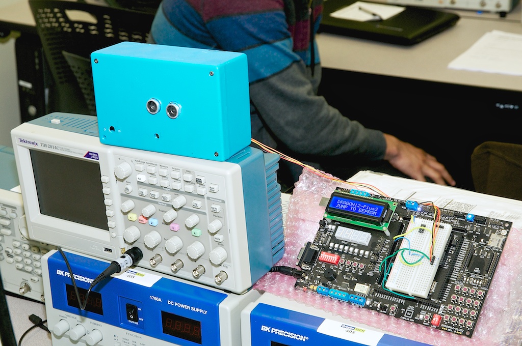 "My idea for the term end project is to use an ultrasonic module HC-SR04 and the Dragon-12 microcontroller board as a home garage proximity sensor for parking a vehicle at the appropriate distance from the wall."