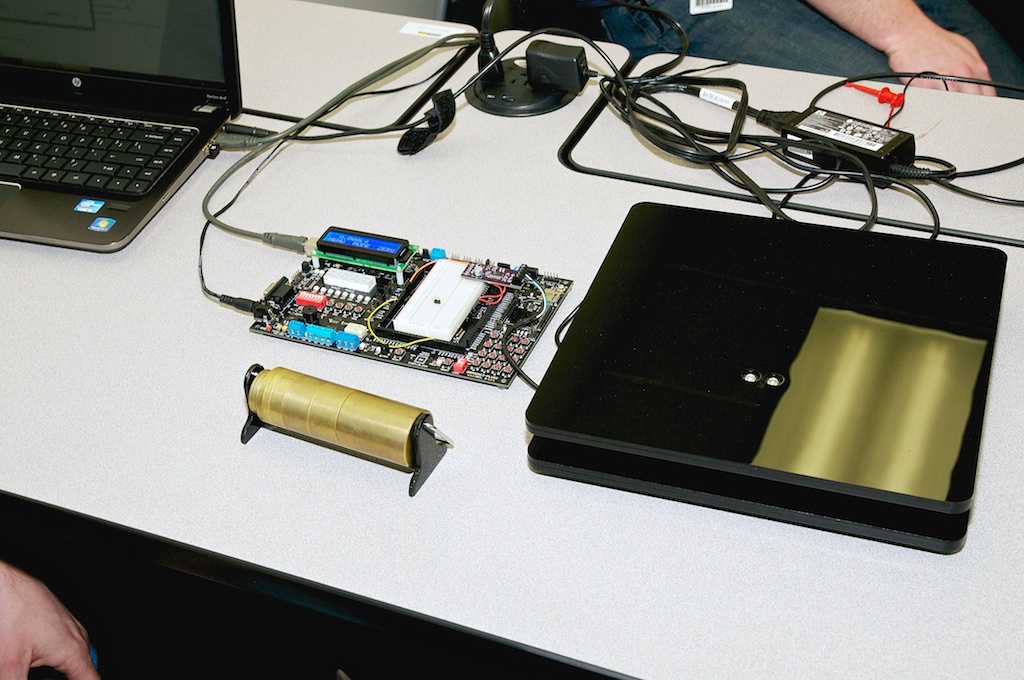 "The scale consists of a Dragon12 development board, a load cell platform, and an amplifier/ADC circuit. [...] A user interface is provided to allow functions such as unit selection and calibration, and a standard RS232 protocol has been implemented to allow interface with PC software."