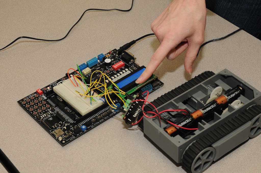 "The program uses the keypad on the Dragon12 for control and an LCD display for instructions. Using two DC motors, the tank is able to go forward and backward, and it is also able to turn left and right by spinning the motors in opposite directions."