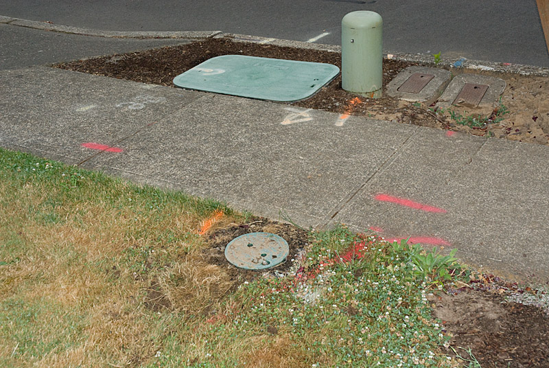 The day before the installation a crew of two men came out to install the fiber from the street to the house. The street termination is on the right of the house but the garage is on the left. So the buried the cable (digging the trench by hand!) from the street...