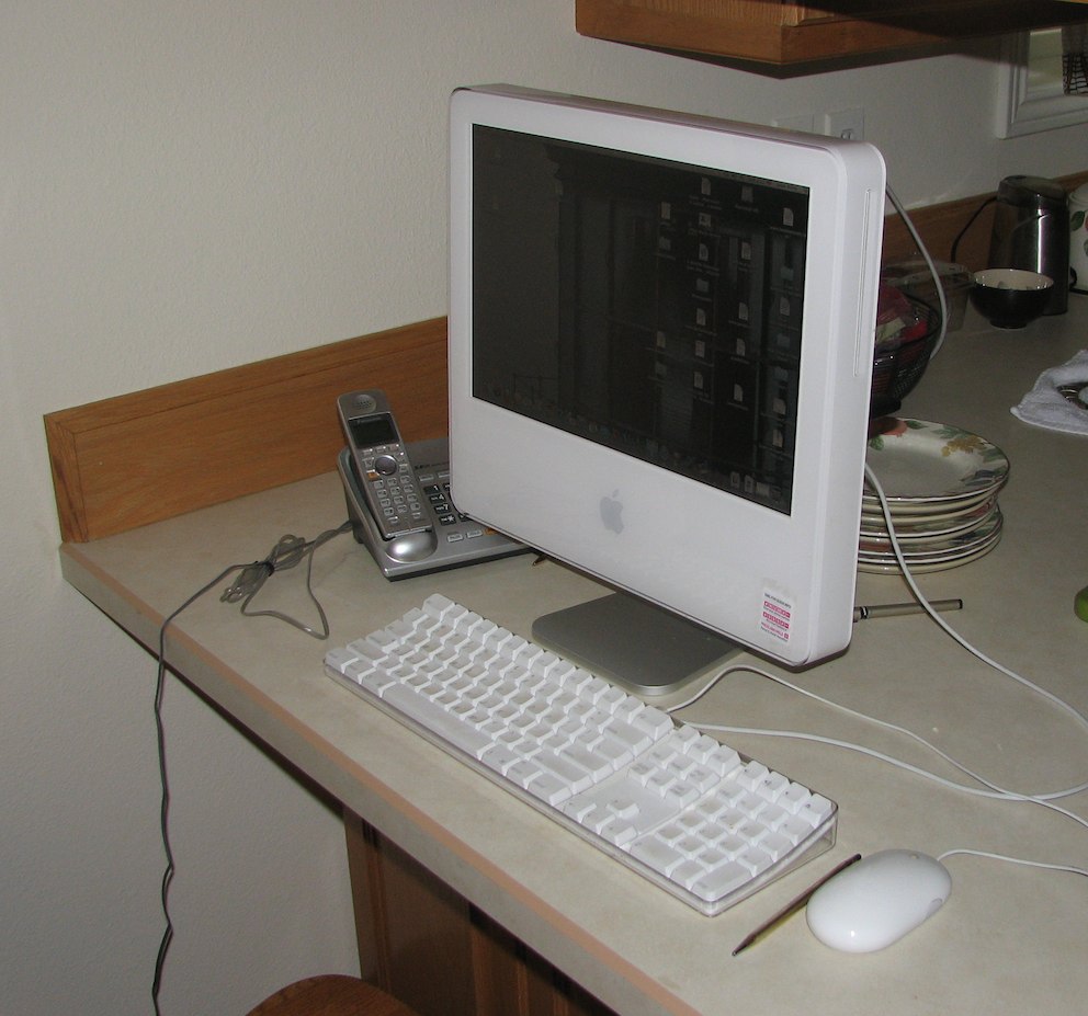 Apple iMac G5, 1.6GHz PowerPC G5; 1 GB RAM; 80GB HD; DVD-ROM/CDRW drive; 17" display; OS X; Purchased 12/04. Original 512MB RAM replaced with 1GB RAM 11/07 when upgrading to Leopard. Given away in 2011 when power supply died.