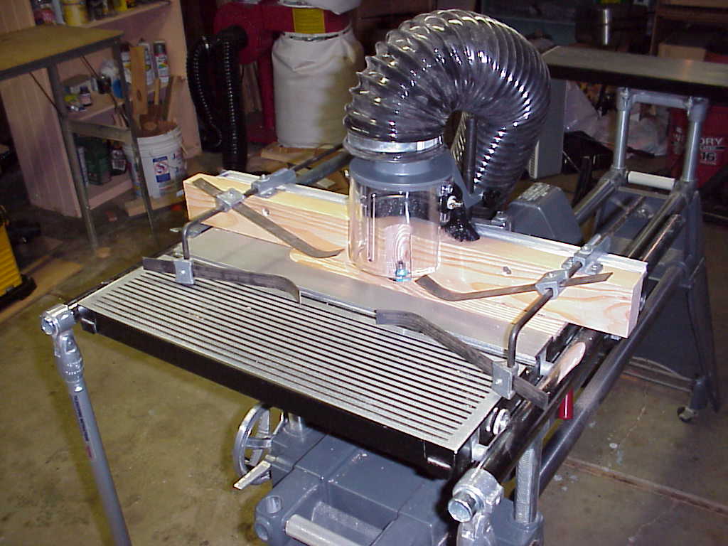 This is my shop, showing my Shopsmith Mark V that I've had since the early 80's, Craftsman RAS (even older), and various other tools in nooks and crannies. Mounted on the wall on the right are the bandsaw, jointer, and belt sander accessories for the Shopsmith. Under the RAS is a DeWalt planer and my old Craftsman router table. Since the picture was taken, I've replaced the router table with a Jointech Cabinetmaker System -- a much larger table with a precision fence. Alas the company is now out of business. This table would appear at the far right of the picture, if it were there! The shelf above holds various jigs and fixtures and long strips of molding. There's also a dust collector and plywood storage off camera. The shop occupies 1/4 of our two car garage. Click on the images to see more detail.